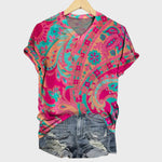 Izstopajte s to živahno majico! Odkrijte intenzivne odtenke fuksije in turkizne, ki pritegnejo poglede, ter impresivne pisane vzorce, ki dodajo poletni značaj.