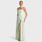 Odkrijte popolno obleko za pritegnitev pogledov in osvajanje na vsakem koraku. Njena brezramena zasnova in stranski razporek združujeta senzualnost in sofisticiranost, kar jo dela idealno izbiro za dogodke, kjer ste vi v središču pozornosti.